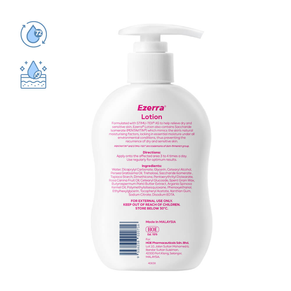 Formulated with STIMU-TEX® AS to help relieve dry and sensitive skin. Ezerra® Lotion also contains PENTAVITIN® (Saccharide Isomerate) which mimics the skin’s natural moisturising factors, locking in essential moisture under all environmental conditions, thus preventing the recurrence of dry and sensitive skin.
